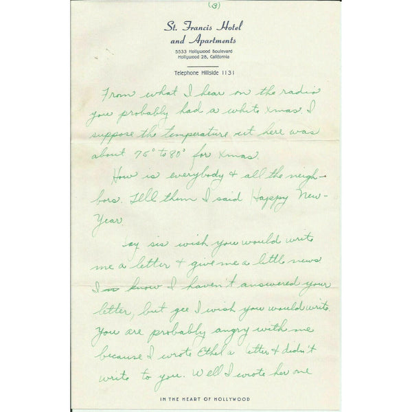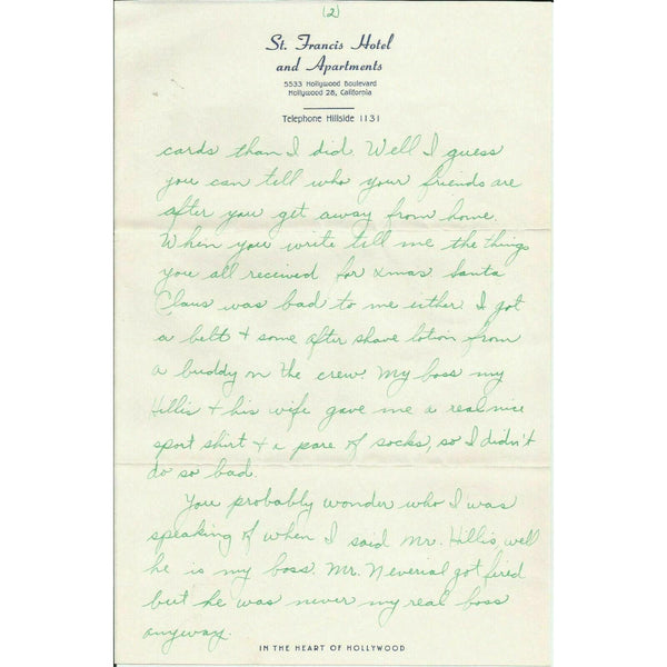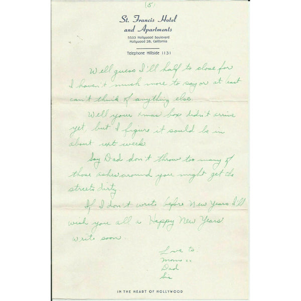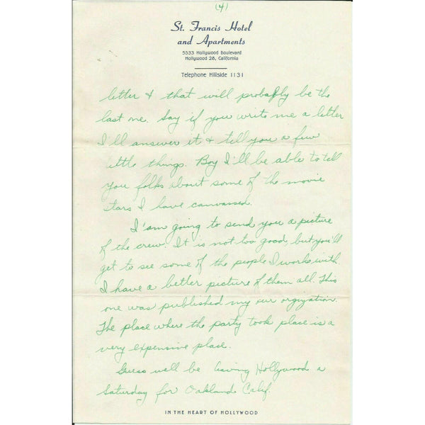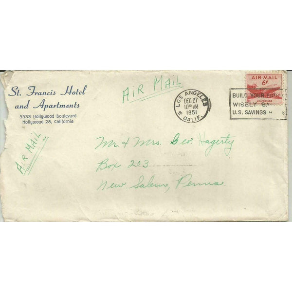 1951 St. Francis Hotel Hollywood CA Vtg Letter Stationery Letterhead Envelope